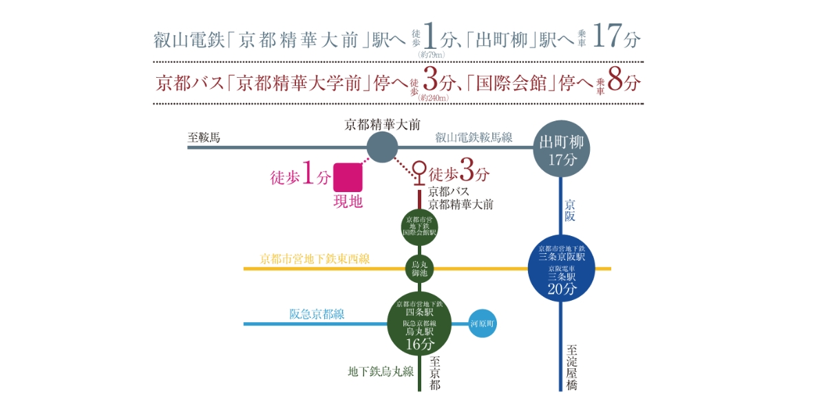 徒歩1分の叡山電鉄「京都精華大前」駅から乗車21分、「出町柳」駅で京阪電車に乗り継ぎ「三条」駅へ4分。