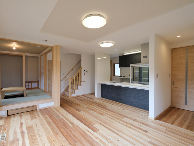 リビングの床には京都府内産の無垢フローリング「牛若丸」を使用。湿度の高い梅雨時期から夏にかけ、空気中の水分を吸収し、逆に湿度の低い冬季には水分を発散。季節を問わず快適な暮らしが叶う空間、ぜひそのぬくもりを素足でご体感下さい。(写真:6号地LDK)